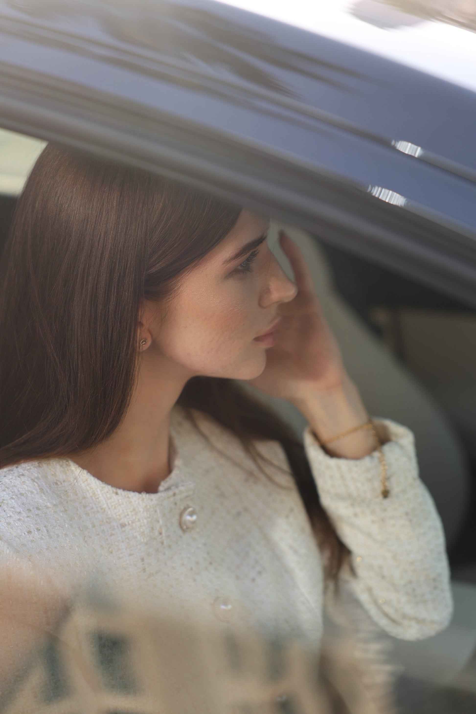 The cropped jacket with elegant pearl buttons and matching A-line skirt offer a refined yet feminine look. Softly tailored and luxuriously textured.